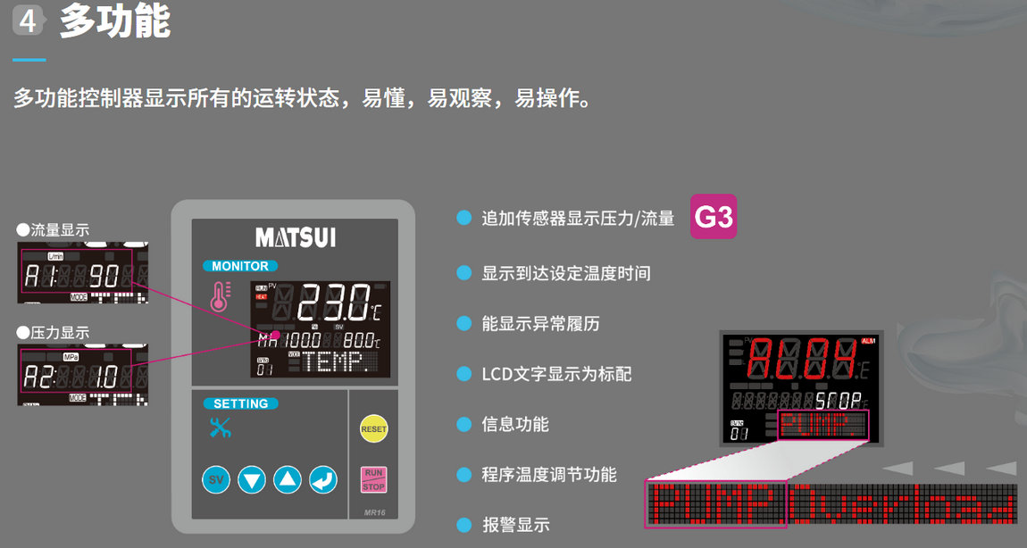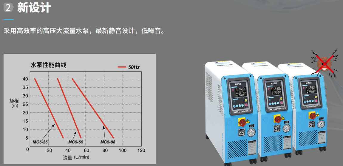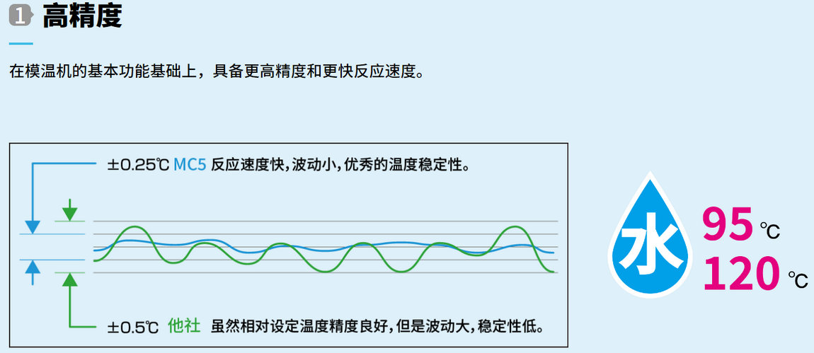 具备卓越性能,更高精度,更快反应速度的高品质专业模具温度控制机,适用于各种成型工况。水式标准型G3版95°C~120°C