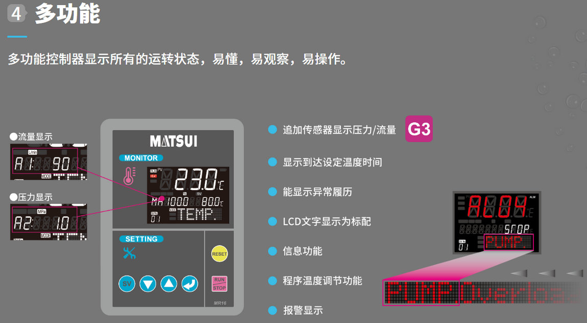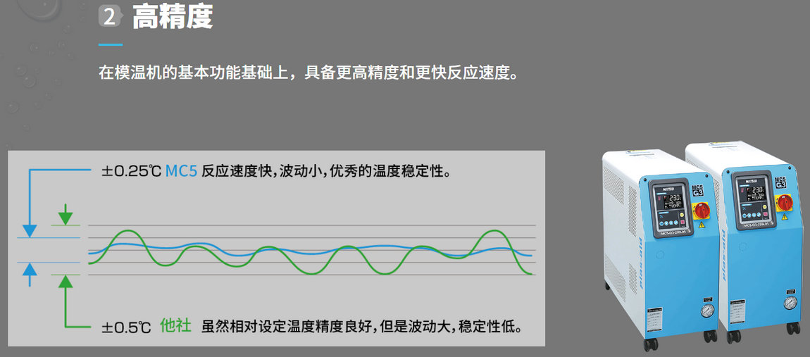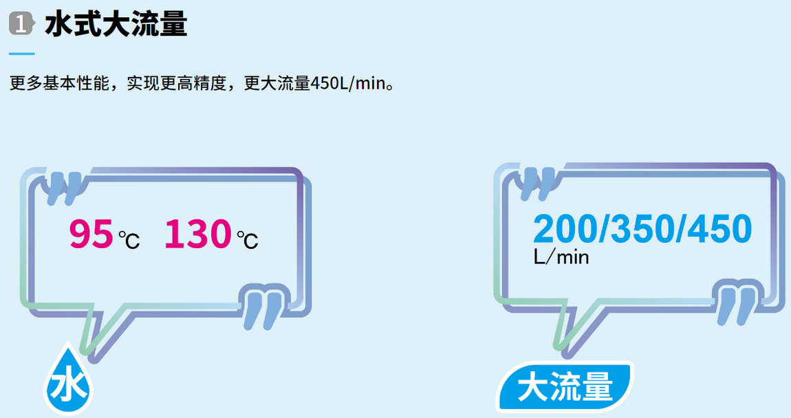 具备卓越性能,更高精度,更快反应速度的高品质专业模温机。水式大流量型G3版95°C/130°C200、350、450L/min。