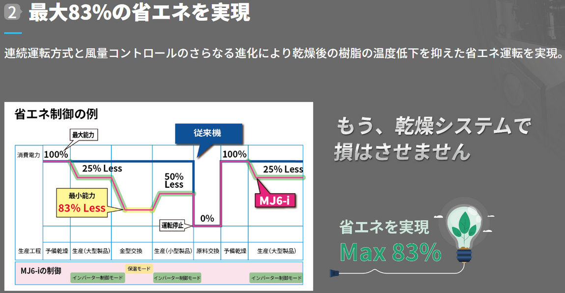 フル生産、少量生産、一時生産停止などの使用状況に応じて運転モードを自動調整し、旧機種に比べて大幅にエネルギー、資源を節約した。最大乾燥省エネ83%で、乾燥システムにこれ以上のエネルギー損失がないようにする。スマート化除湿乾燥機による最大乾燥省エネ83%。